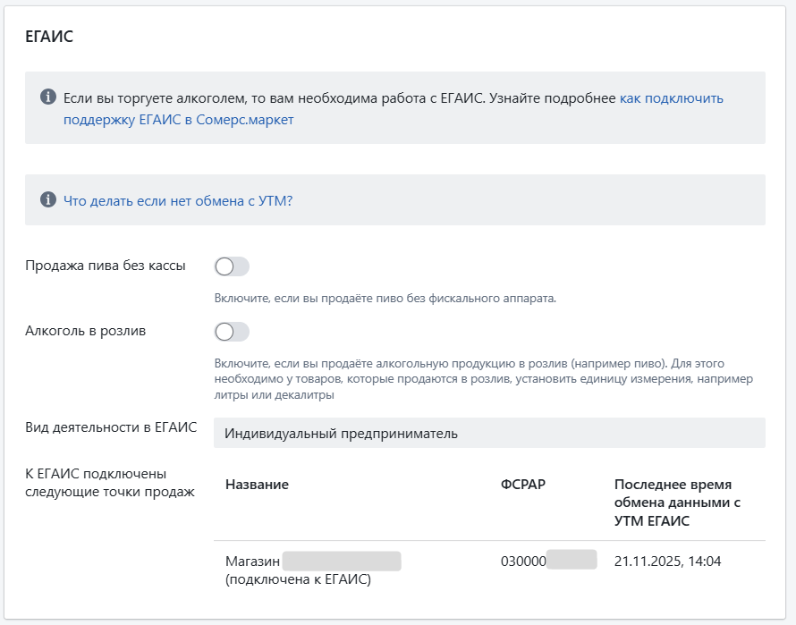 В нём содержится дата и время последнего обмена данными с УТМ ЕГАИС, а также название точки продаж, на склад которой поступают накладные