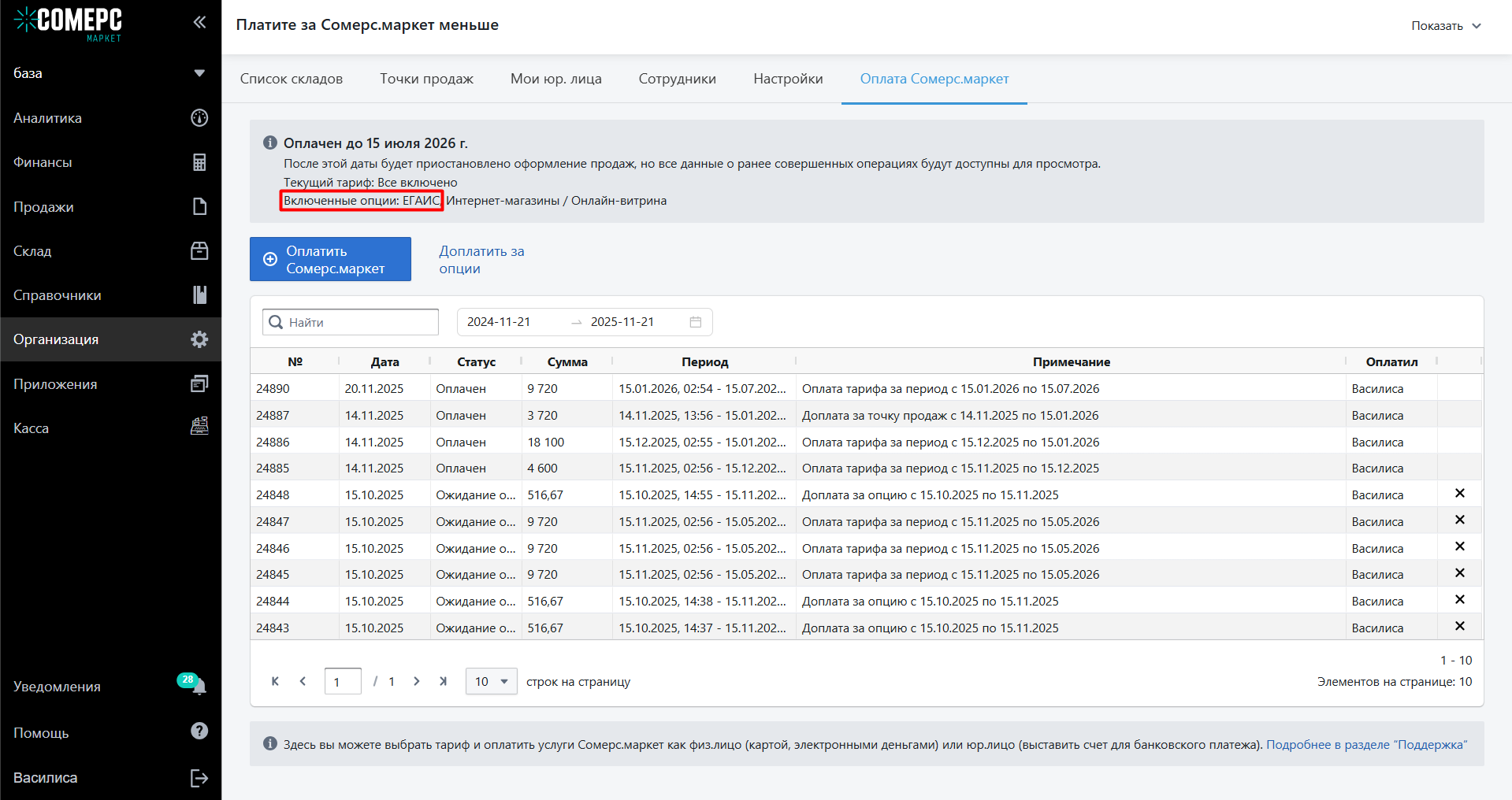 - Убедитесь, что в текущей подписке активен аддон ЕГАИС