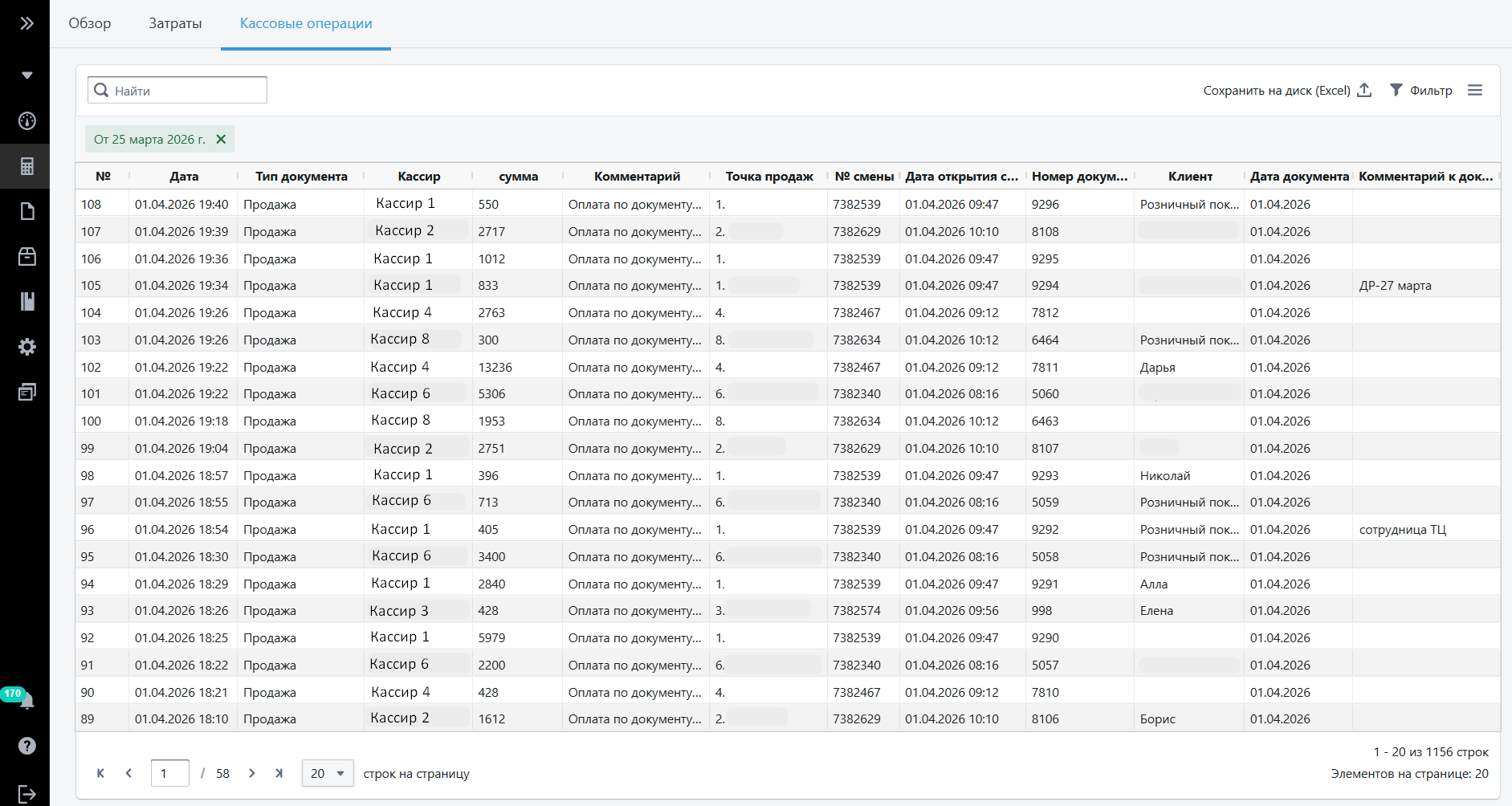 - отображение всех кассовых операций с детальной информацией по каждой транзакции