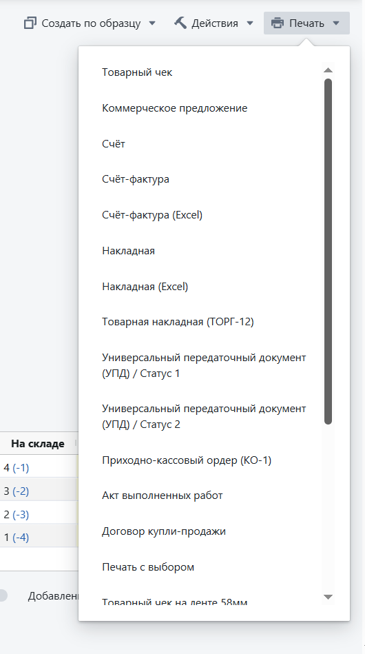 В редакторе заказа нажмите кнопку Печать в правом верхнем углу — откроется список стандартных печатных форм для документа продажи.