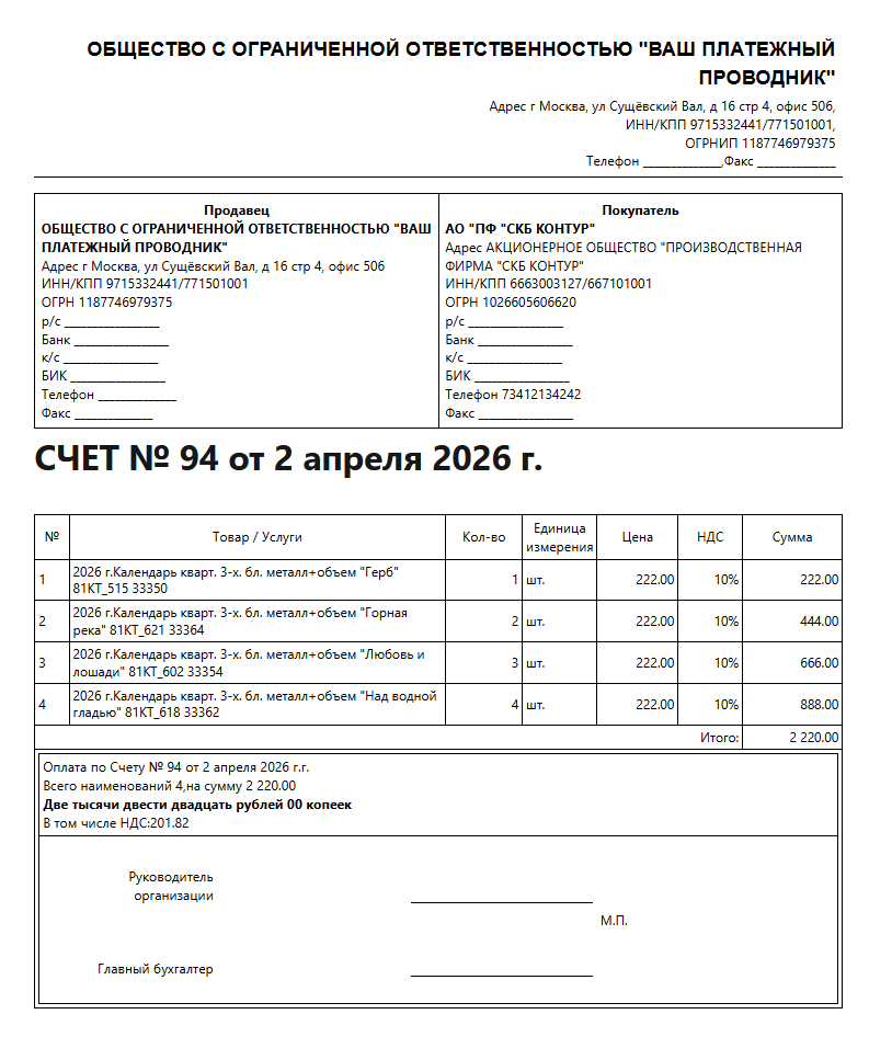 Если вы заполнили юридические реквизиты вашей организации в разделе Организация — Мои юрлица, а реквизиты клиента заполнены в разделе Справочники — Клиенты, они подставятся в документ автоматически
